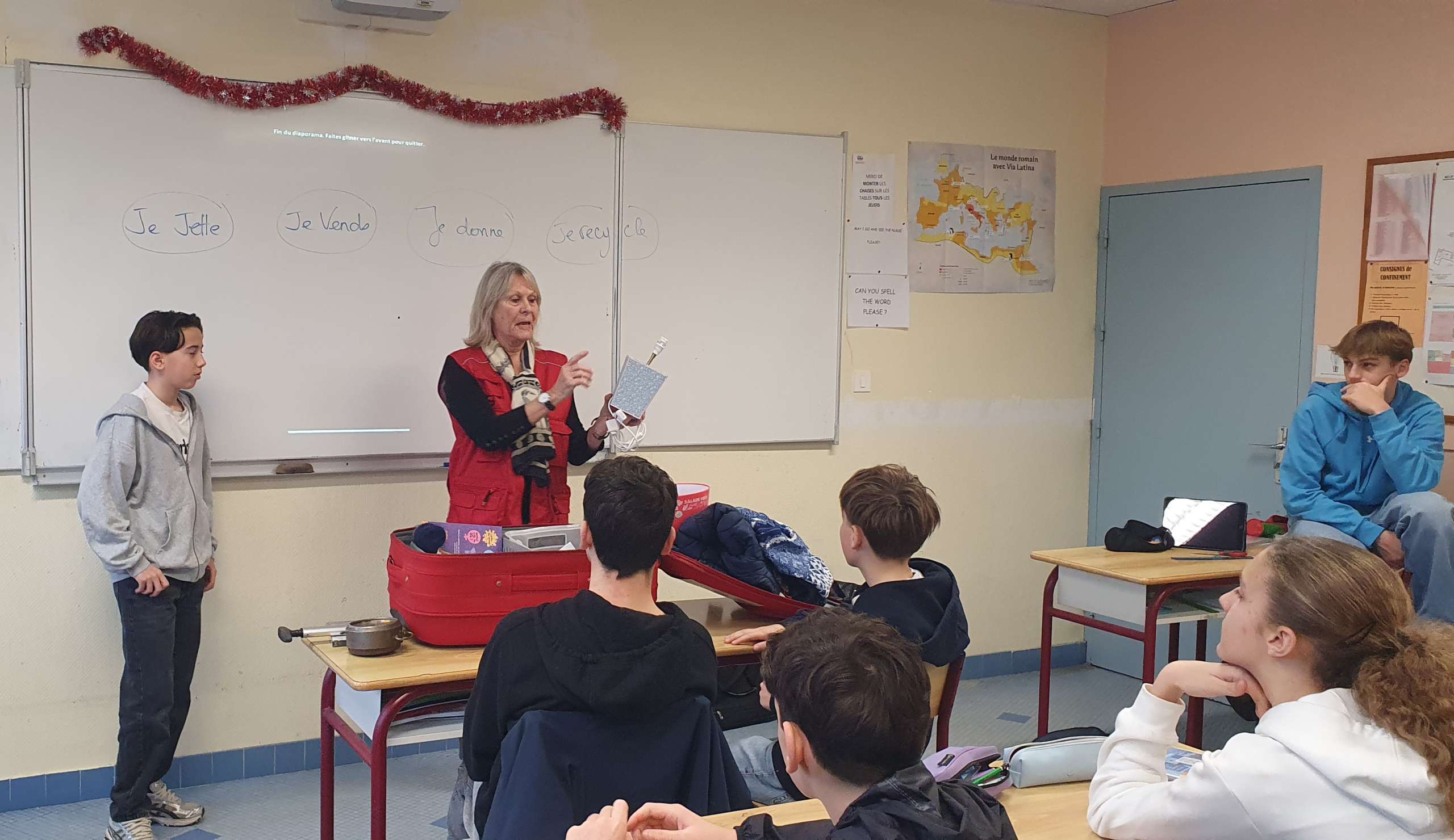Après une présentation, les élèves ont été invités à réfléchir aux catégories de dons afin de comprendre ce qui pourra être vendu, ce qui sera donné ou recyclé ou ce qui ne pourra servir à nouveau. On leur a indiqué qu’ils pouvaient également être bénévoles, quelques heures ou un peu plus, si leurs parents étaient d’accord.