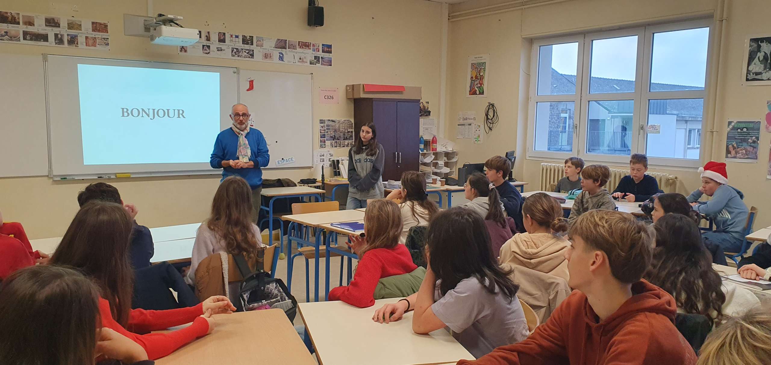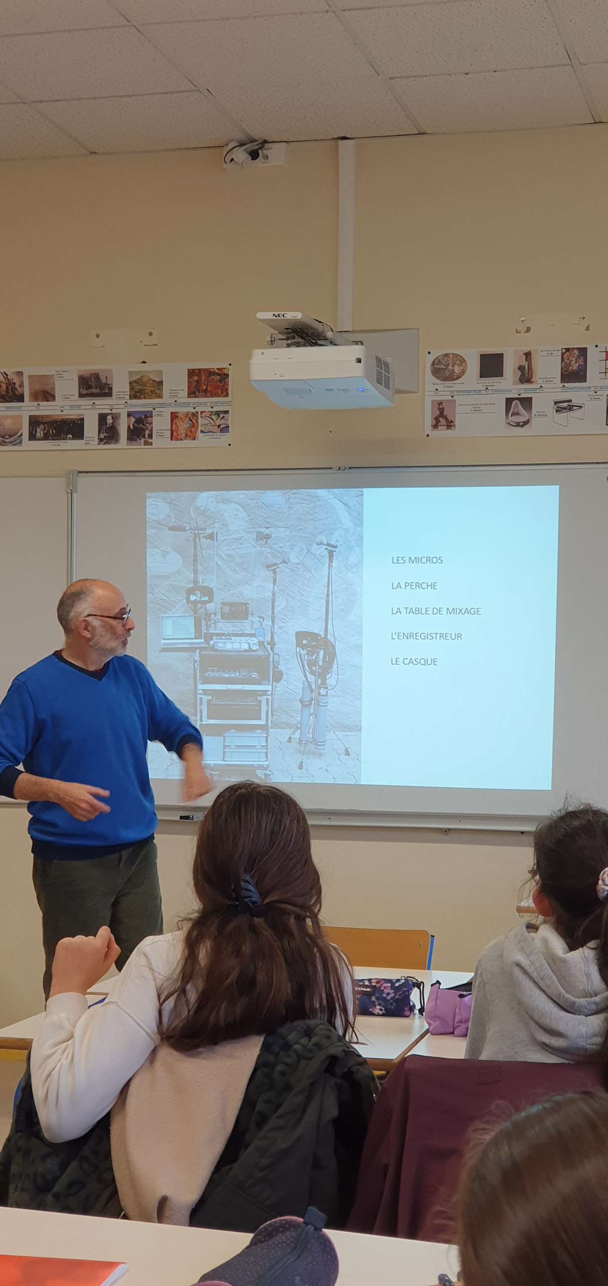 Alain Brasseur, régisseur son et réalisateur, est venu parler de la sonorisation au cinéma à nos 29 élèves afin qu’ils comprennent à quel point cet aspect est crucial dans la réalisation. “Le son, c’est 51% du film” affirme-t-il !