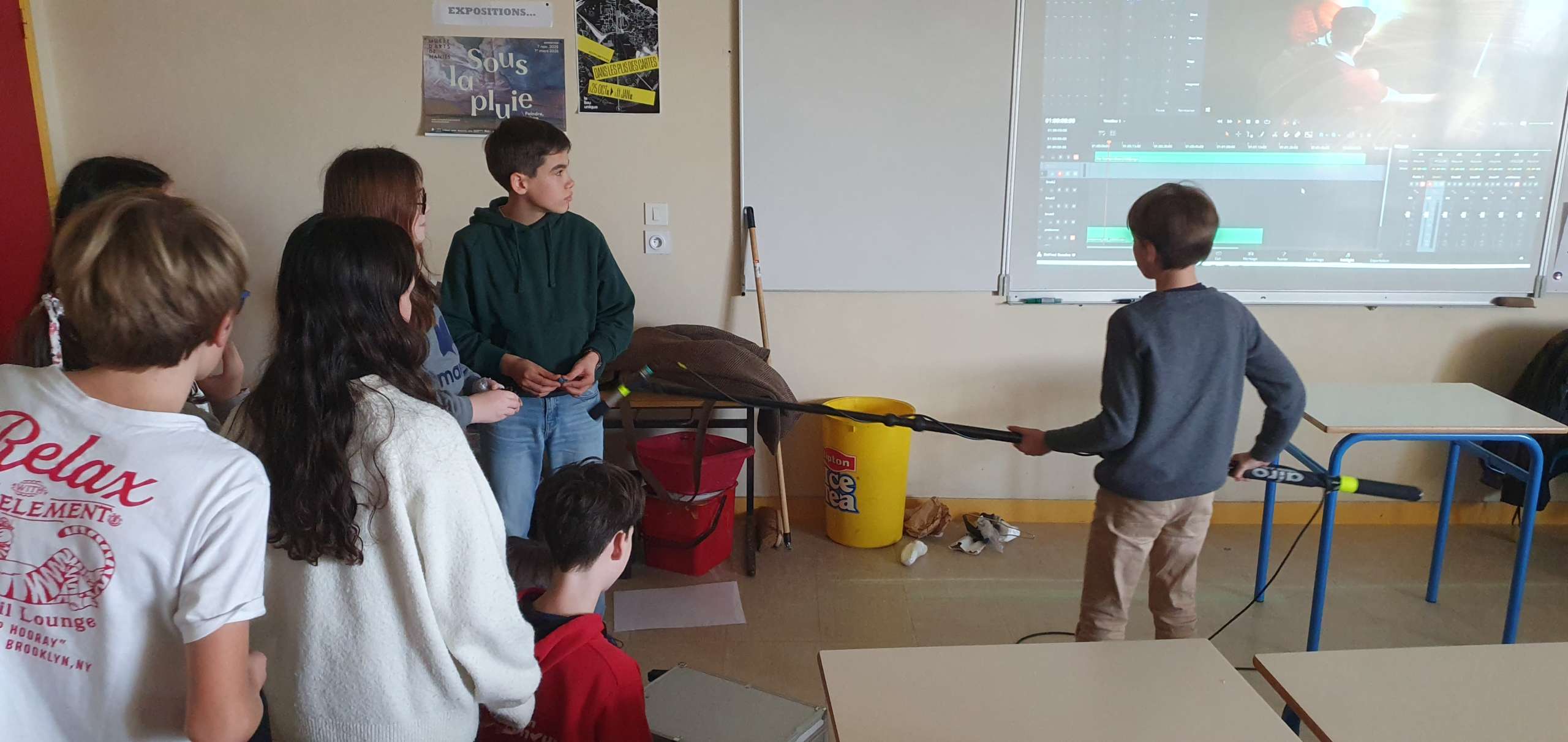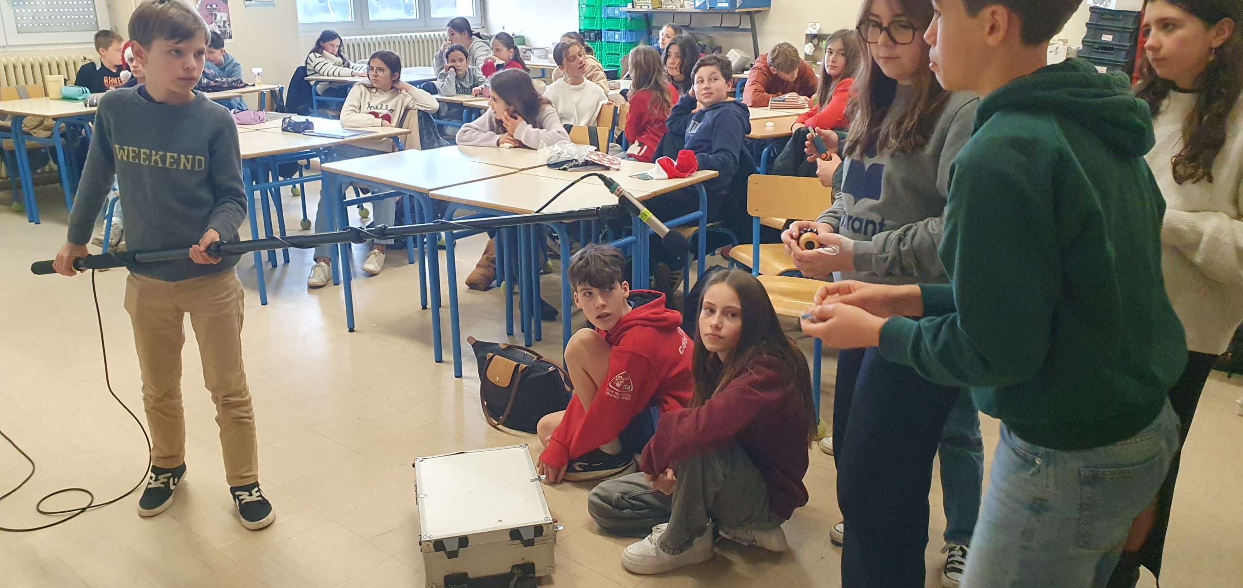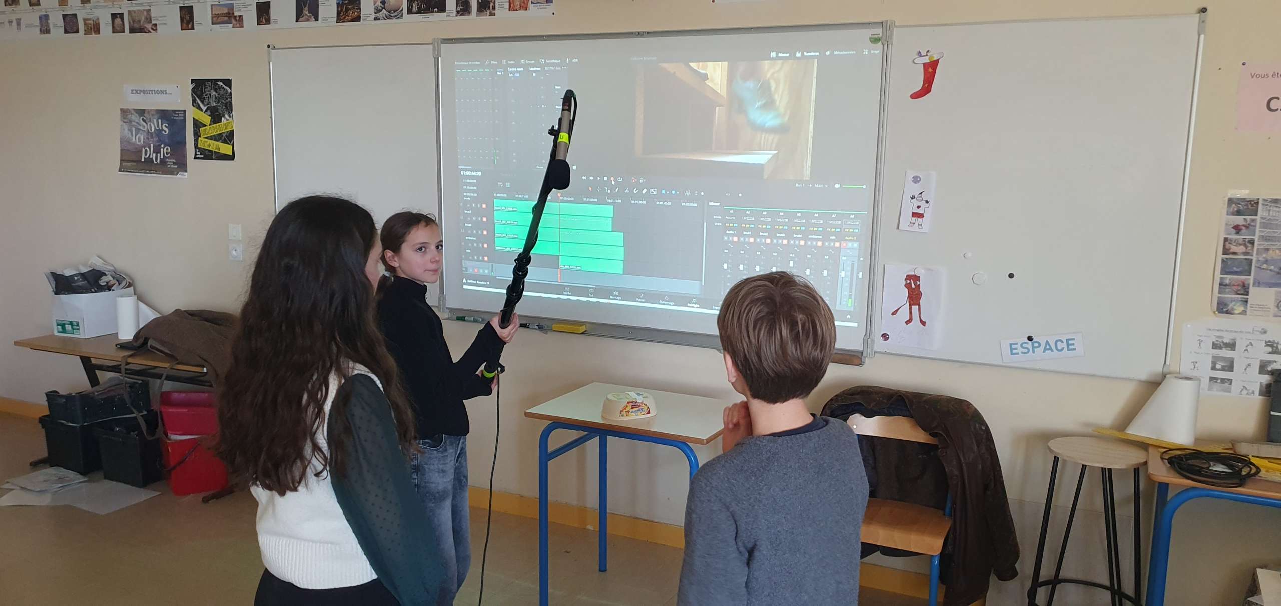 Après une introduction un peu plus théorique, les élèves ont pu s’initier au doublage et au bruitage sur un extrait d’Harry Potter et de The Truman Show qu’ils avaient vu il y a 2 semaines.